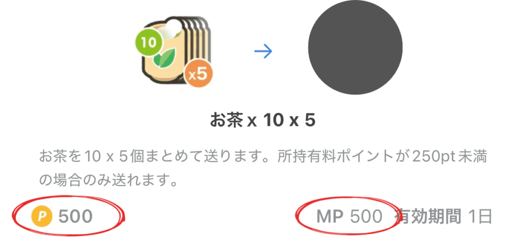 お茶10×5はお茶10を5個まとめて送れるアイテムで、有料ポイントが250pt未満であれば、無料ポイント500ptで送信が可能となっています。
